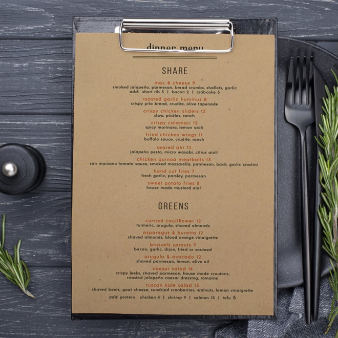 Thick Brown Kraft Uncoated - 18 pt. paper stock that comes in a light brown color and with visible flecks of natural fibers, By providing your product with an authentic and organic look. Choose Premium Brown Kraft Menu Printing or Wedding Menu Printing From PrintMagic and to create products that are bound to look and feel classy while adding a rustic element to your business.
