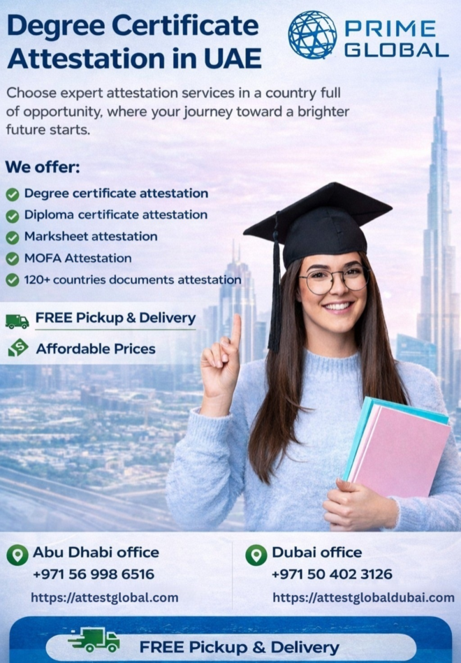 Prime Global Attestation is a leading name in the UAE for degree certificate attestation services. With years of experience and a dedicated team, they handle the attestation process efficiently, saving you time and avoiding complications.