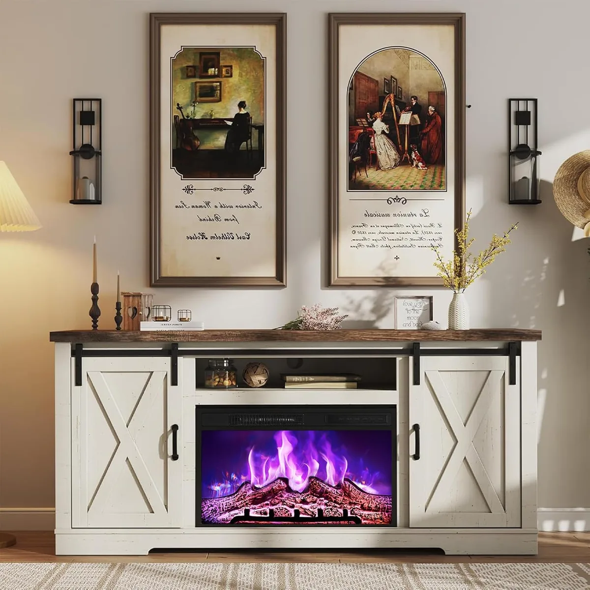 AMERLIFE Fireplace TV Stand with Sliding Barn Door for TVs up to 73", Farmhouse 63" Fireplace Entertainment Center with Storage Cabinets/Adjustable Shelves, Distressed White & Barnwood