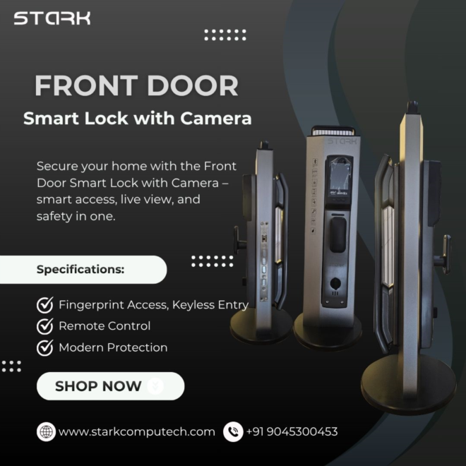 Enhance your home security with the Front Door Smart Lock with Camera from Stark Computech. This advanced smart lock combines keyless entry and real-time video monitoring for ultimate convenience and safety. Control access via smartphone, view live footage, and receive instant alerts from anywhere. Perfect for modern homes seeking style, security, and smart connectivity.