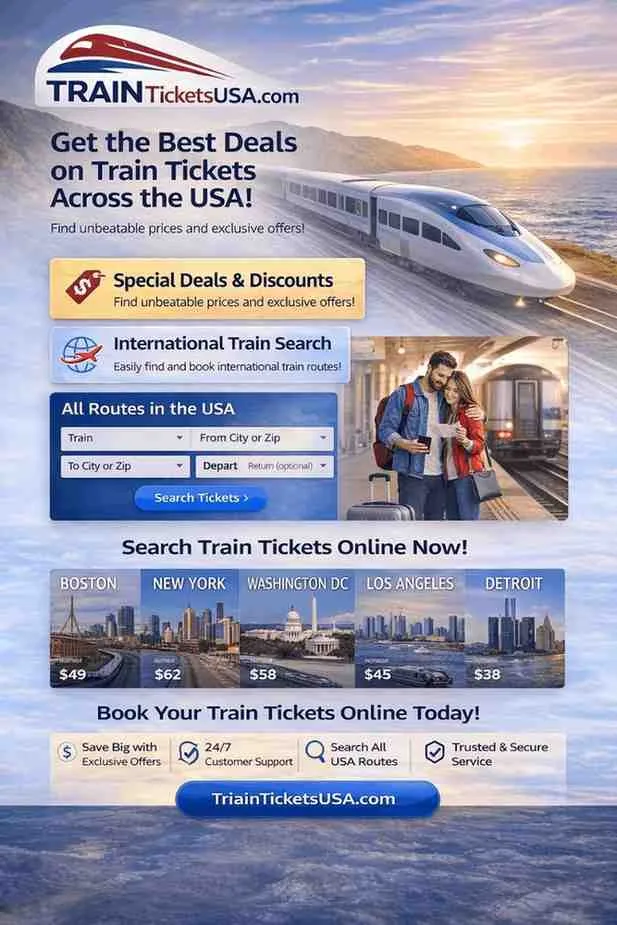 This poster promotes traintickets.com, on this online platform for booking train tickets across the United States. It meanly promoting some features like special deals and discounts, international train search, and across all routes in the USA. The design showcases popular destinations like Boston, New York, Washington DC, Los Angeles, and Detroit, with affordablity and comfortabilty. A user-friendly booking system is included to easy get ticket searches. Some additional benefits like build trust.