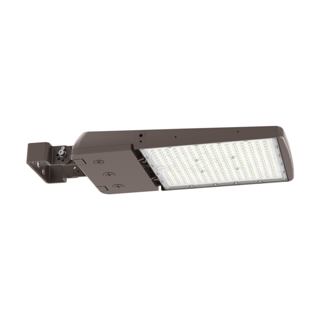 The Flexi Lite Area Light is a fully selectable outdoor lighting fixture offering wattage options of 70W/100W/150W and 200W/240W/300W, delivering up to 46,500 lumens with an efficacy range of 145–155 lm/W. It features selectable CCT settings of 3000K, 4000K, and 5000K with CRI >80, along with lens distribution options of Type III, IV, and V. Built with a die-cast aluminum housing and polycarbonate lens, the fixture operates within -40°C to +50°C, includes standard 0–10V dimming, surge protection up to 10kV, and is available with universal mounting for square or round poles and slipfitter installation. UL Listed, DLC Premium certified, and rated for 50,000 hours with a 5-year warranty, the Flexi Lite Area Light ensures reliable performance for parking areas, shopping centers, and general park lighting.