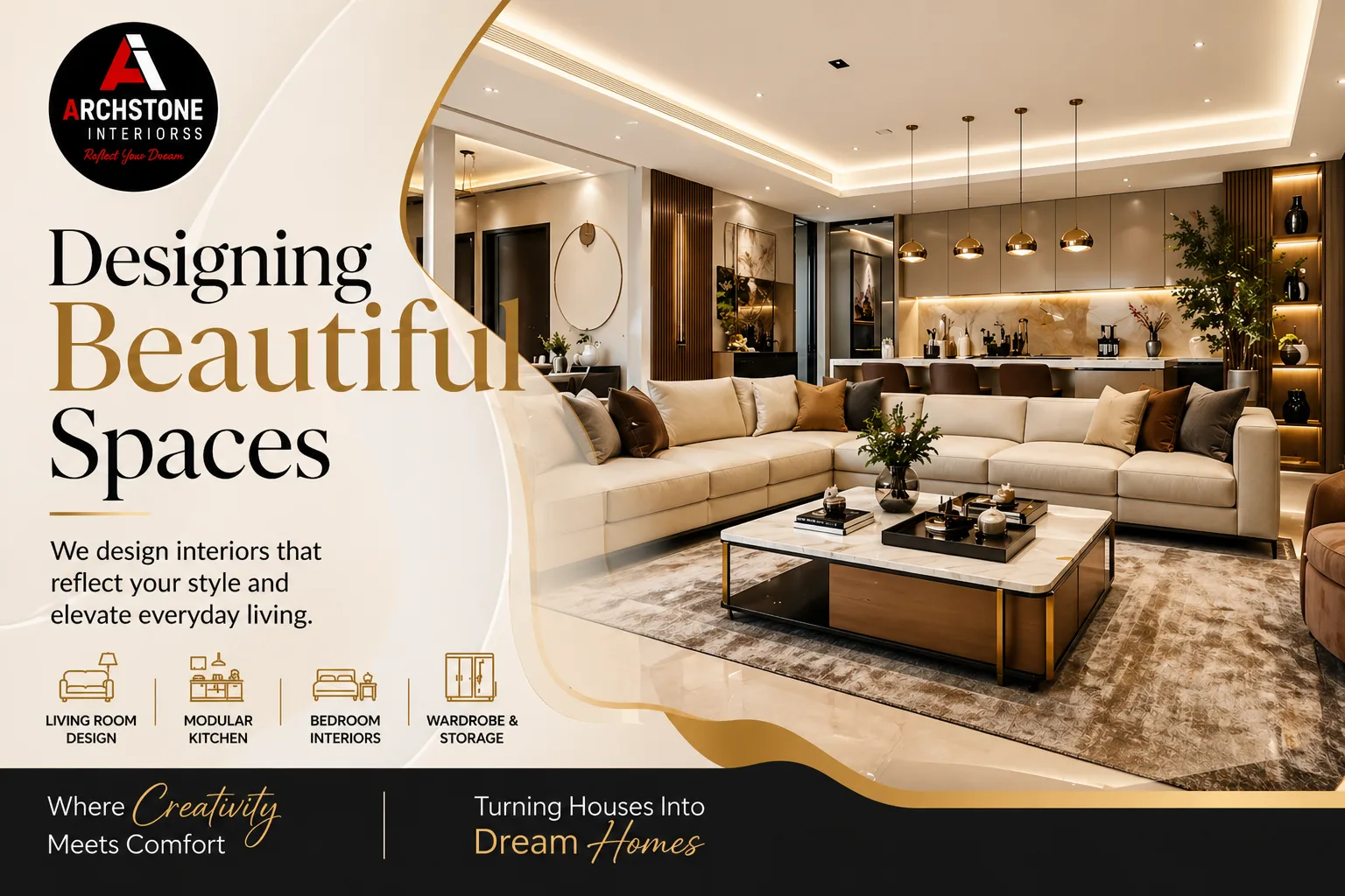 At Archstone Interiors, we believe that good design should be simple and useful. Our team creates layouts that save space and improve comfort. We use quality materials and modern designs to make sure your interiors last long and look great. Whether it is a small apartment or a large house, we design every project with care and attention.
