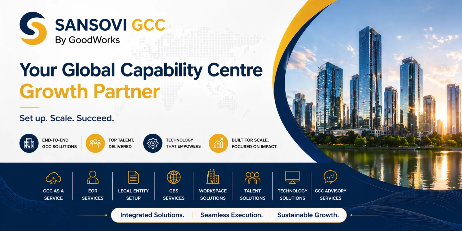 Sansovi GCC by GoodWorks helps enterprises set up, scale, and manage Global Capability Centres (GCCs) with a structured and integrated approach. We offer end-to-end services including GCC as a Service, Employer of Record (EOR), legal entity setup, GBS services, workspace solutions, talent solutions, technology solutions, and GCC advisory services.